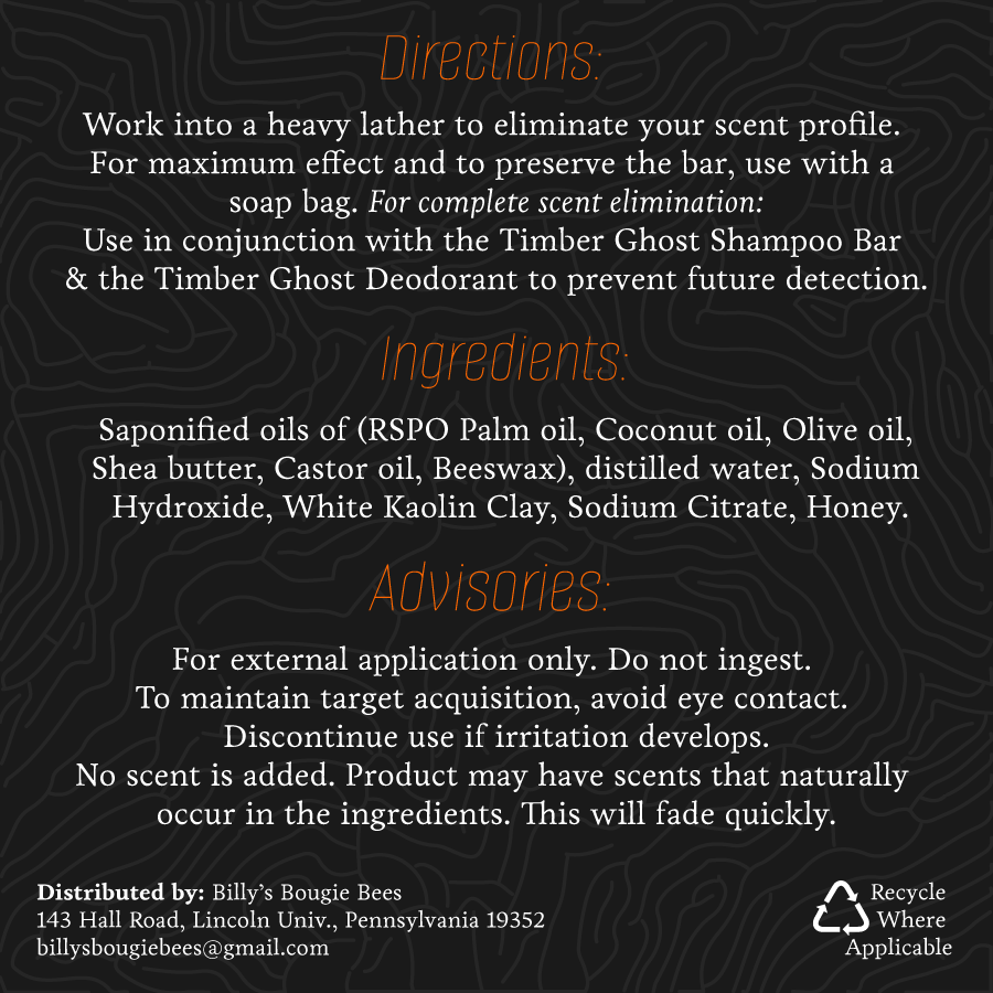 Our natural handcrafted bar soap is a simple as it gets in the shower. No frills, added scents, or nasty chemicals claiming to attack scent molecules to "fool" a deer's nose, just a good clean that leaves you scent free after a hard day of hunting. Pair this up with our Timber Ghost Shampoo bar for a scent free shower experience and get ready for your next hunt!